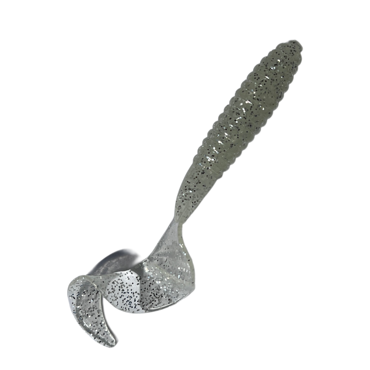 The long curled tail produces smooth, natural swimming action that triggers aggressive strikes from bass and other freshwater predators. The combination of silver and light blue flecks adds an extra dimension of flash and realism, making this lure stand out underwater.